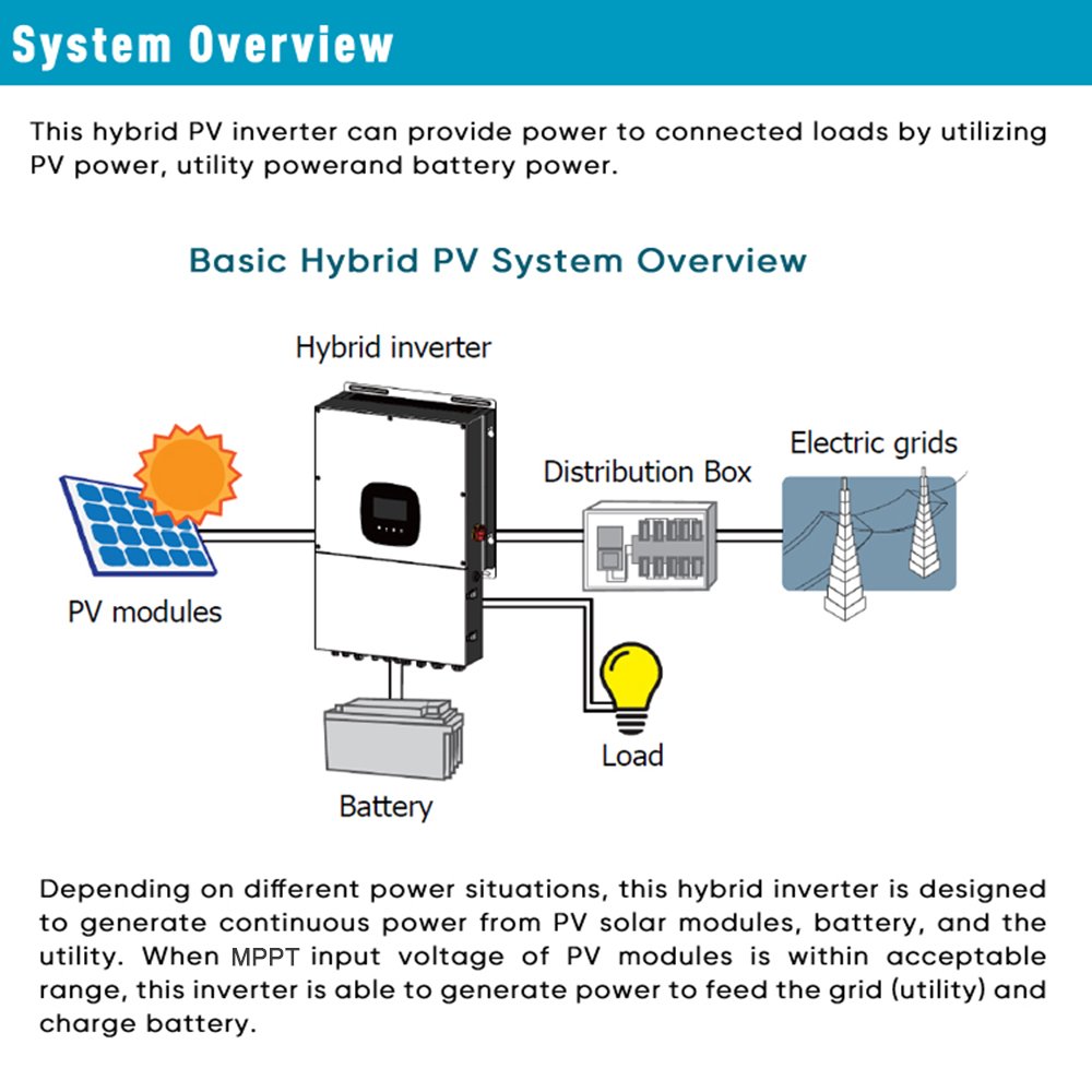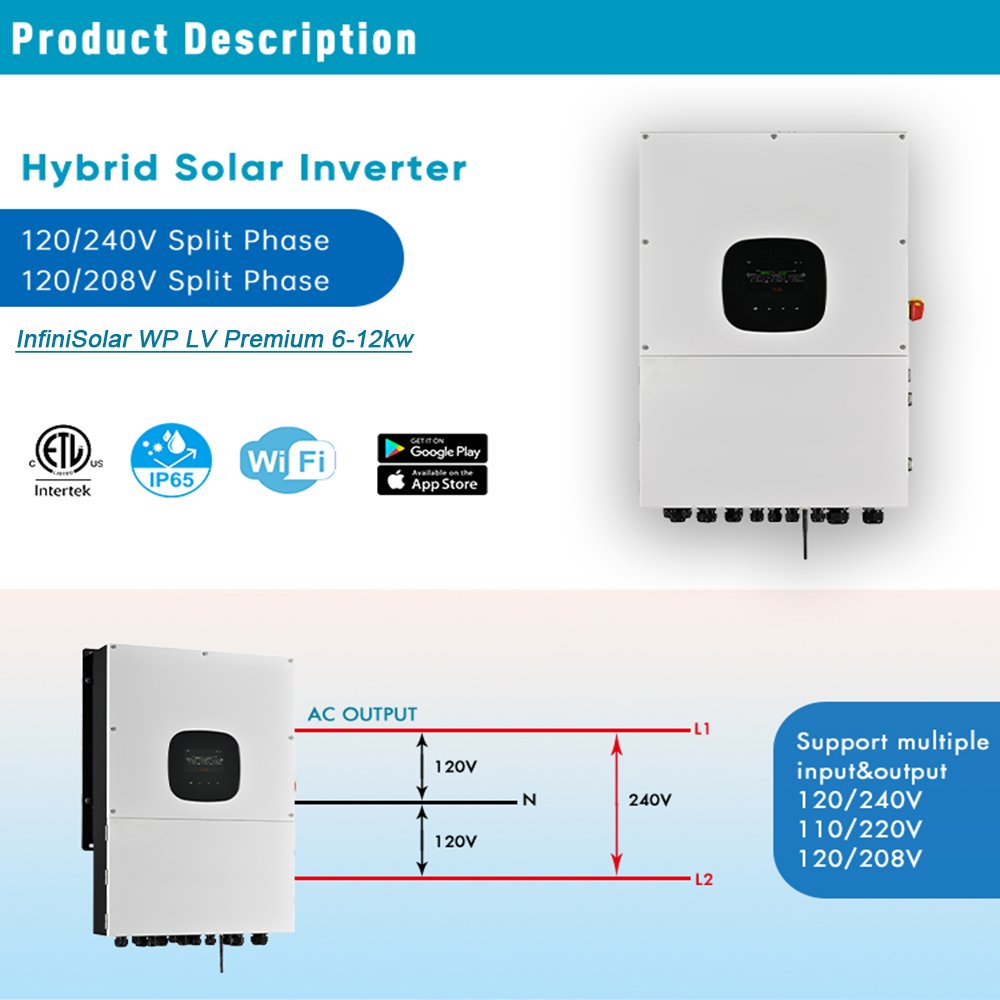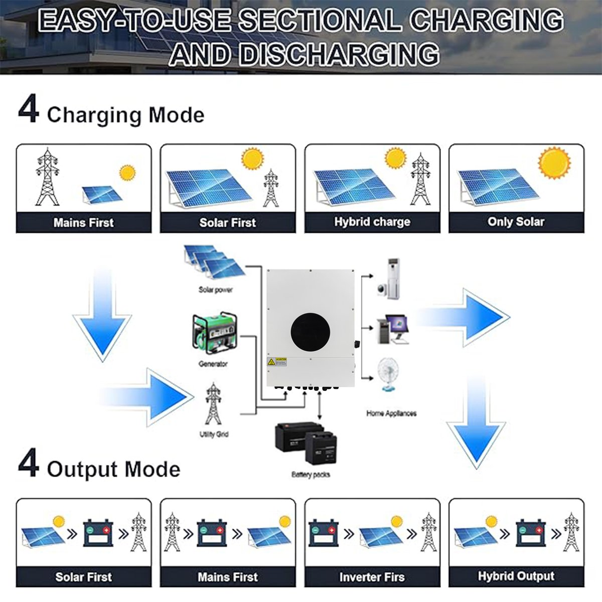 - ⚡【Hybrid Inverter with Grid + Solar + Battery】 6KW / 12KW split-phase inverter supports solar panels, grid, and battery input. Automatically prioritizes solar + battery, seamlessly switching to grid when needed, ensuring 24/7 uninterrupted power.
